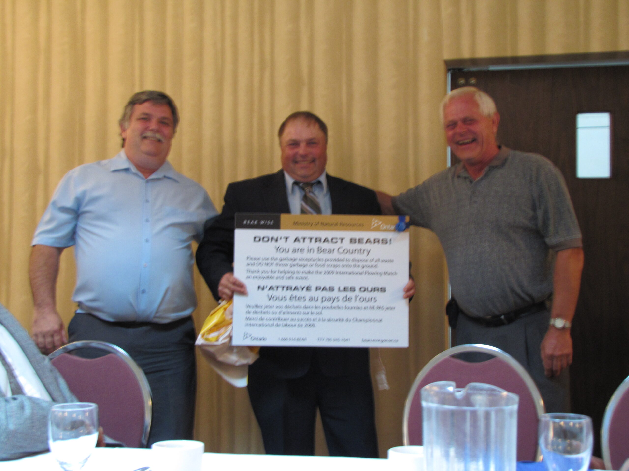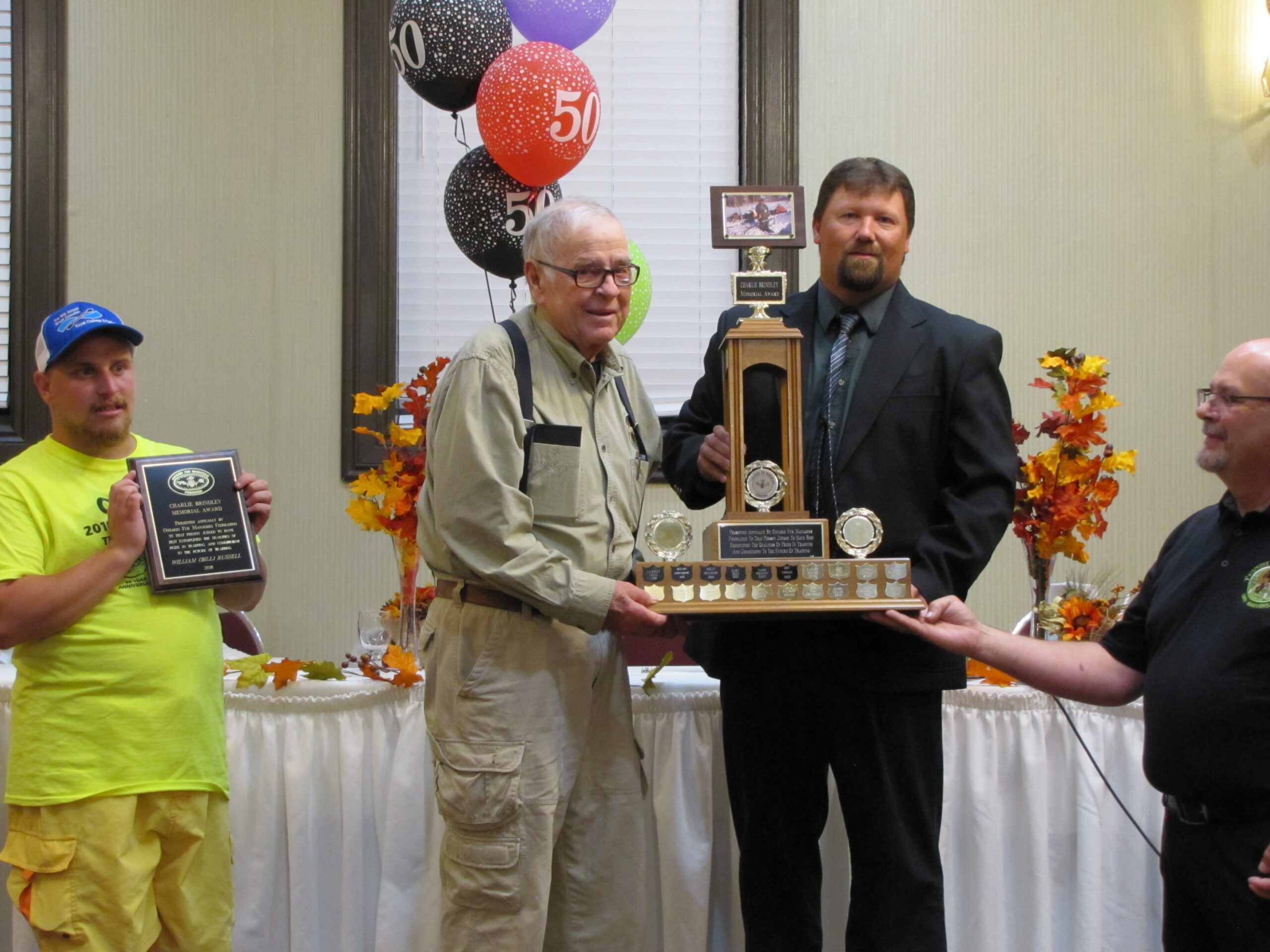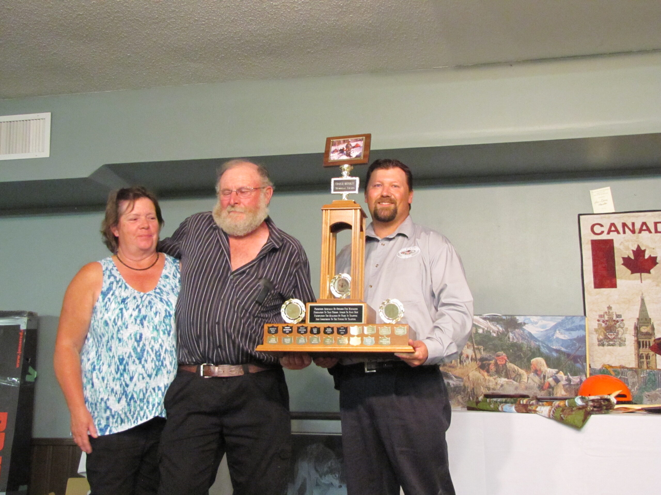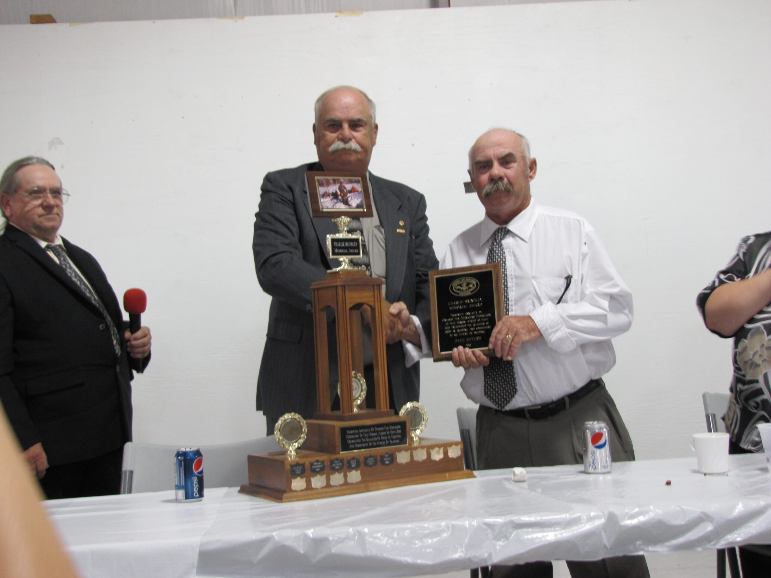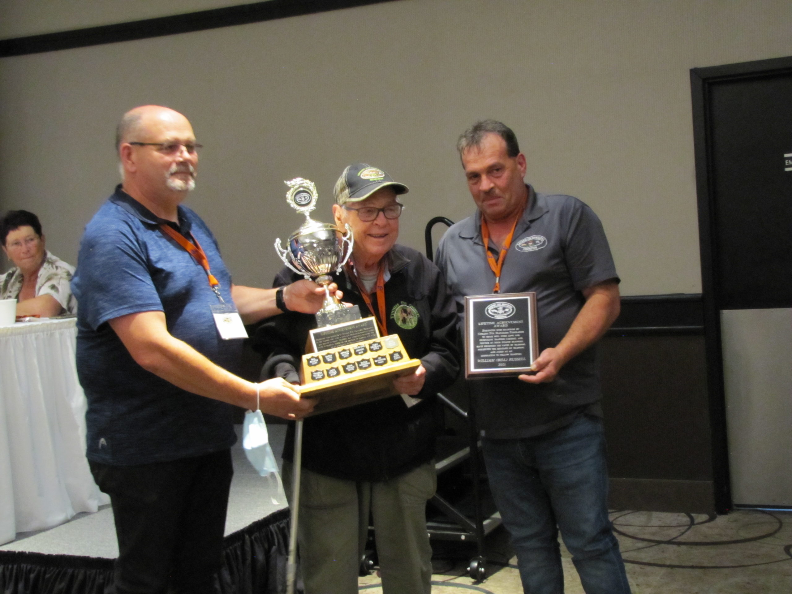 - Bill Davies (center) being awarded the Lifetime Achievement Award by Minister of Natural Resources Graydon Smith (left) and OFMF President Scott Sears (right)