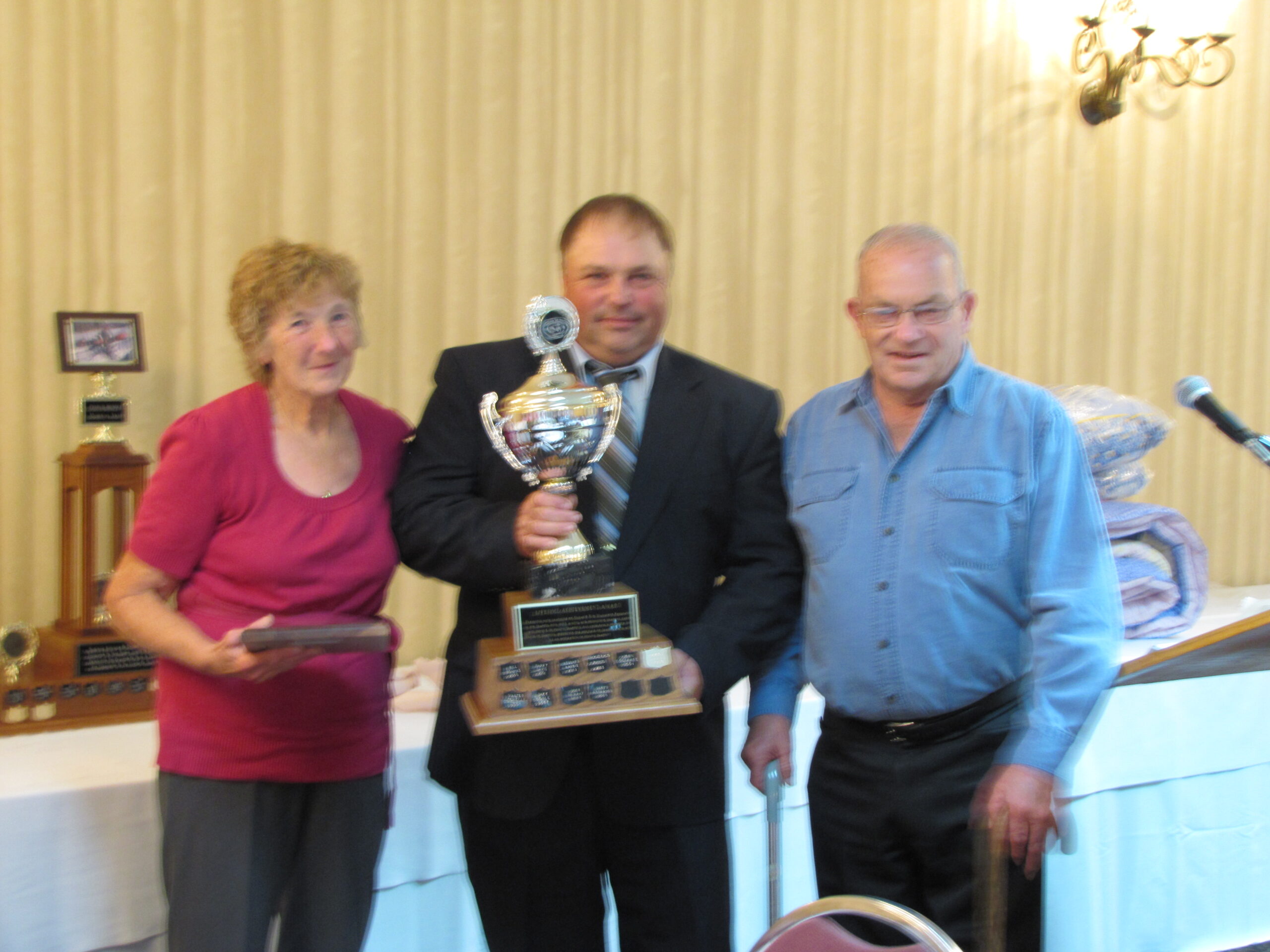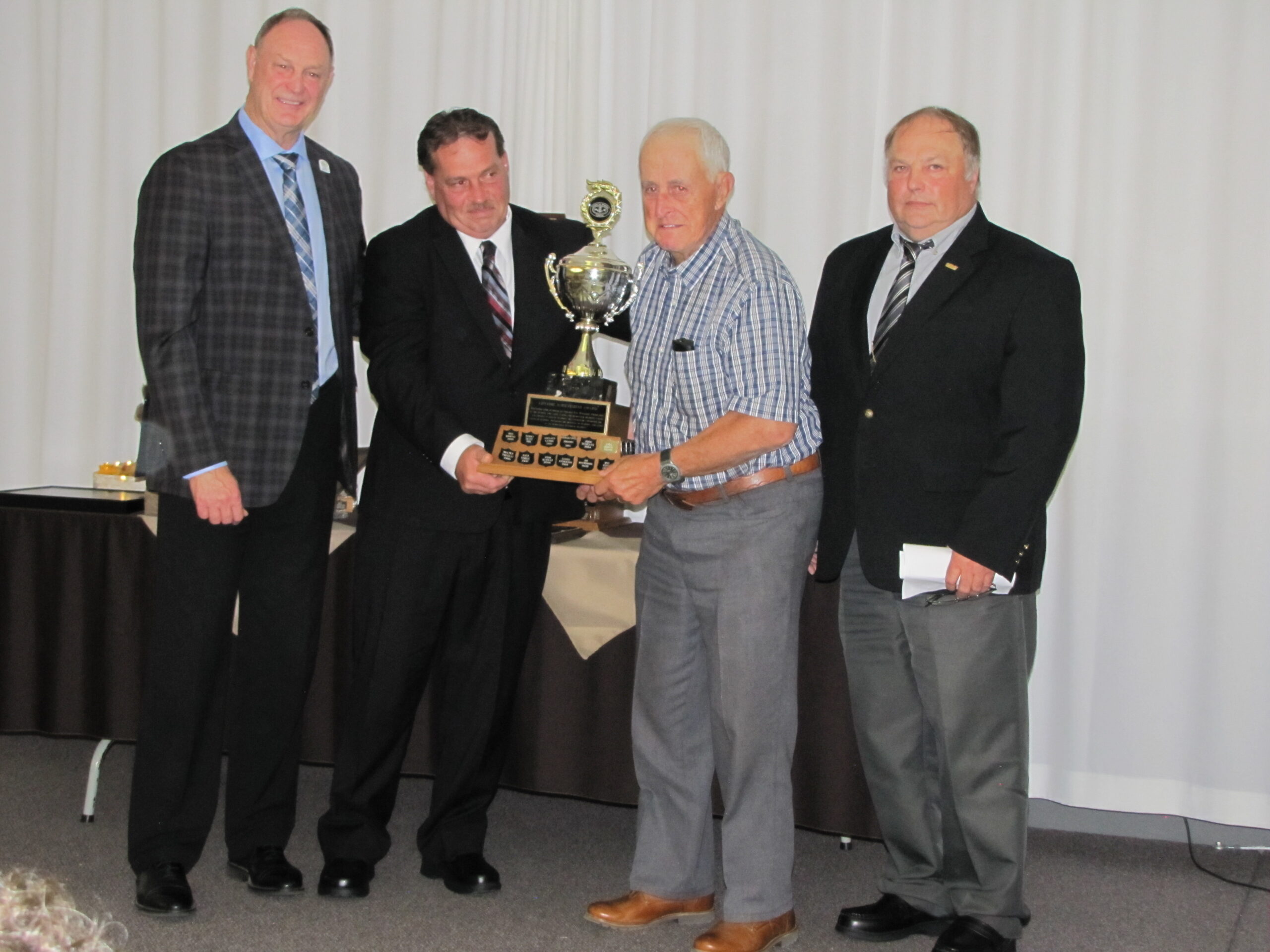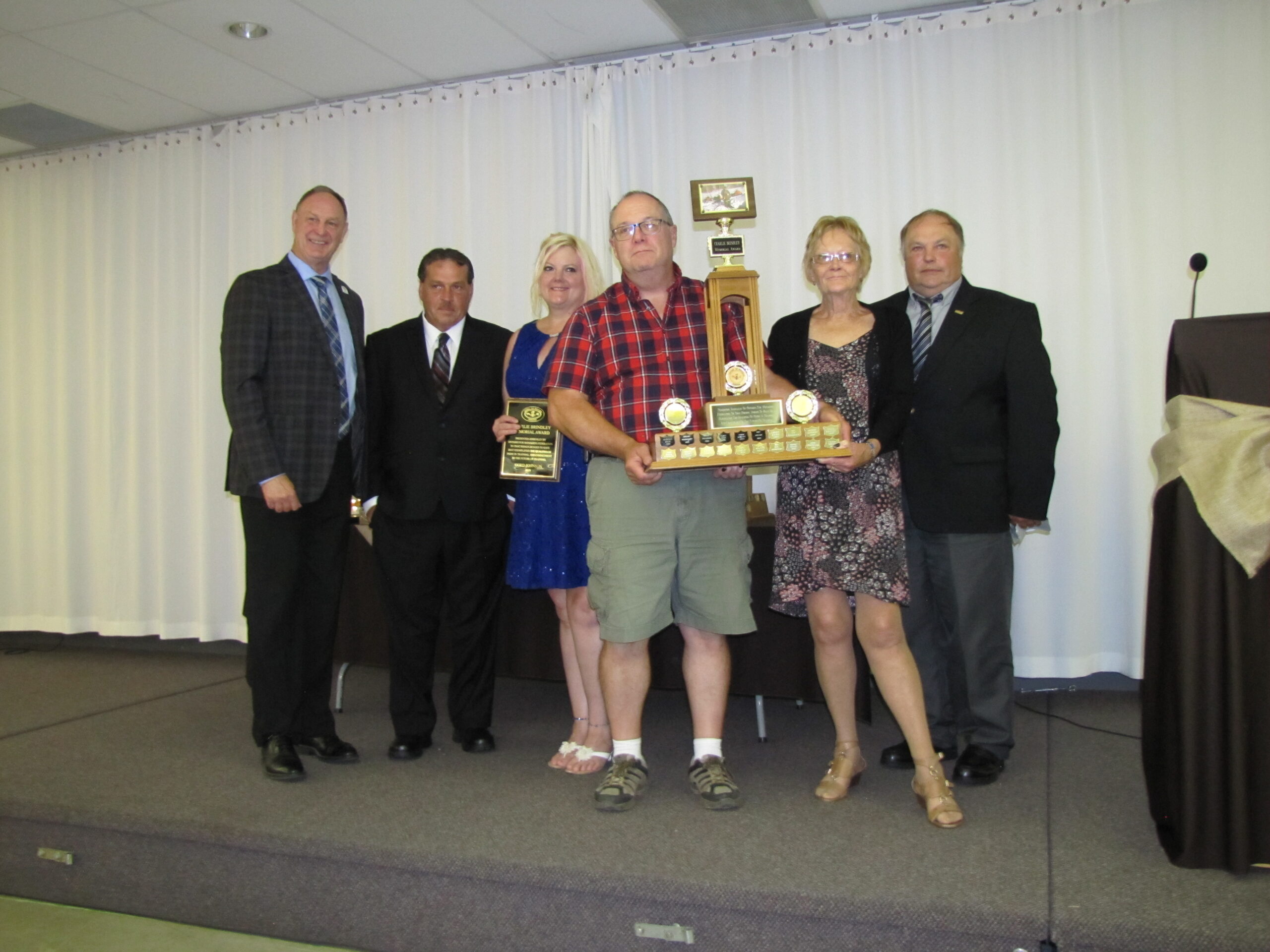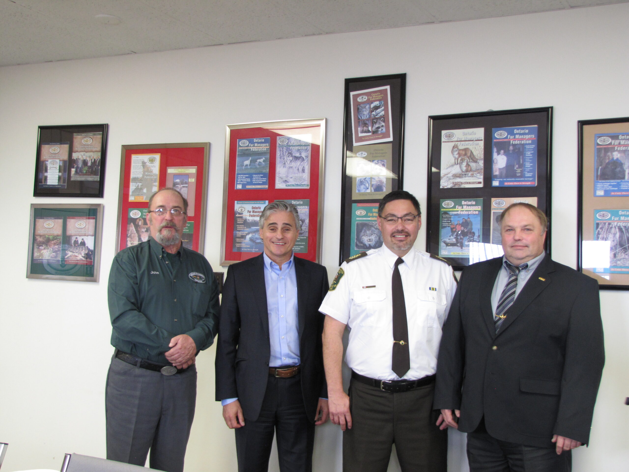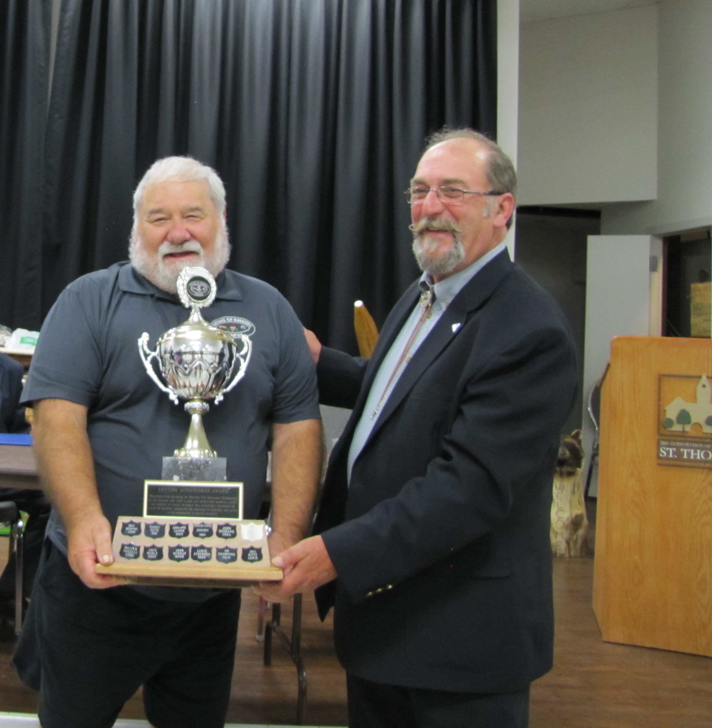 - Bill Davies (center) being awarded the Lifetime Achievement Award by Minister of Natural Resources Graydon Smith (left) and OFMF President Scott Sears (right)